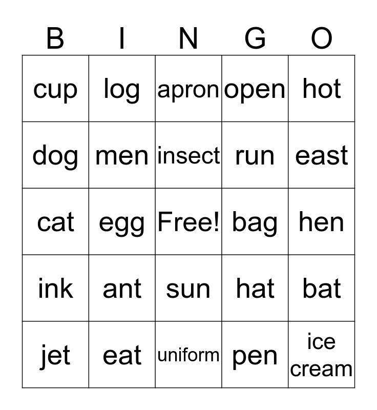 This bingo card has a free space and 24 words: ant, eat, insect, jet, hot, cup, dog, log, bag, sun, run, cat, hat, bat, men, pen, hen, apron, east, egg, ice cream, ink, open and uniform.