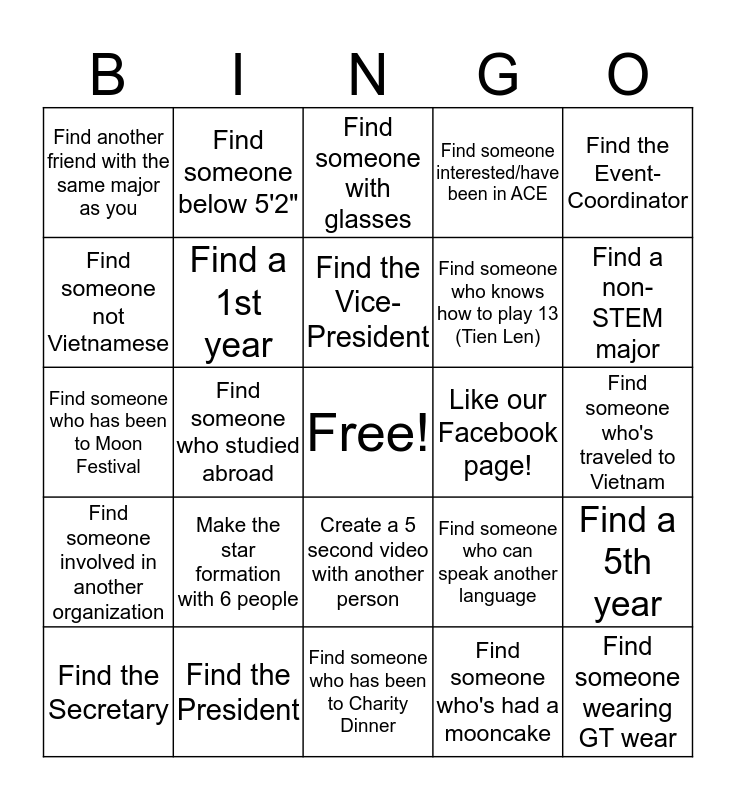 This bingo card has a free space and 24 words: Make the star formation with 6 people, Find the President, Find the Vice-President, Find the Secretary, Find the Event-Coordinator, Find another friend with the same major as you, Find someone not Vietnamese, Find someone below 5'2", Like our Facebook page!, Create a 5 second video with another person, Find someone who knows how to play 13 (Tien Len), Find someone who has been to Moon Festival, Find someone who can speak another language, Find a 5th year, Find a 1st year, Find someone who's had a mooncake, Find someone who's traveled to Vietnam, Find someone with glasses, Find a non-STEM major, Find someone who studied abroad, Find someone wearing GT wear, Find someone involved in another organization, Find someone interested/have been in ACE and Find someone who has been to Charity Dinner.