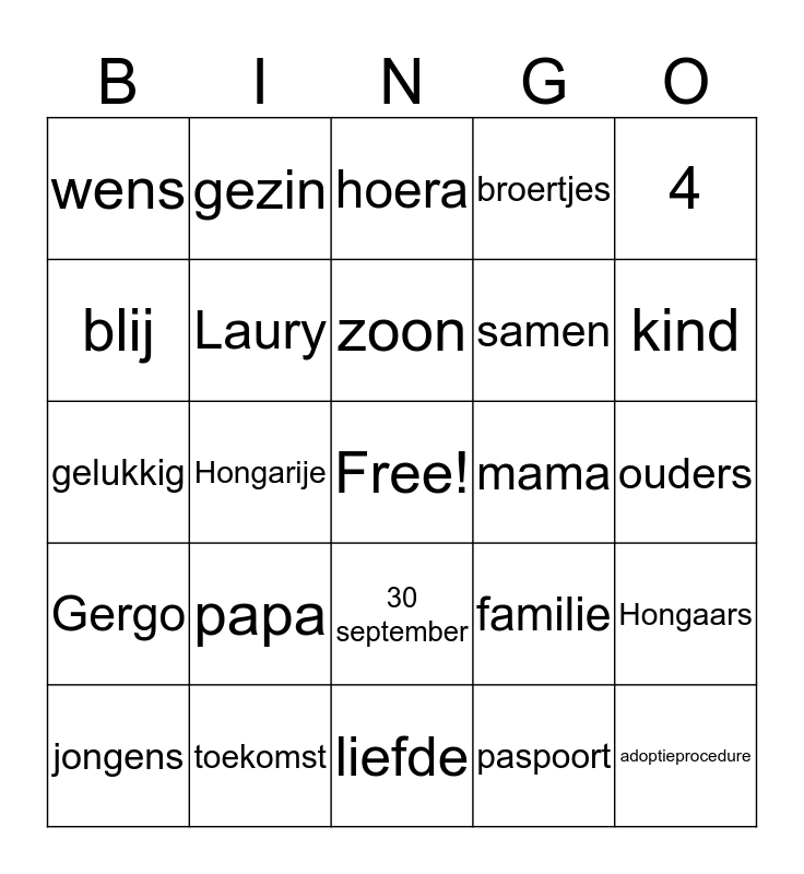 This bingo card has a free space and 33 words: Diego, adoptie, Hongarije, Sjoerd, Gergo, Laury, 4, jongens, gezin, 3, zoon, hoera, welkom, thuis, mama, kind, toekomst, gelukkig, papa, familie, 30 september, wachten, wens, ouders, liefde, adoptieprocedure, broertjes, samen, blij, Hongaars, Nederland, paspoort and reis.