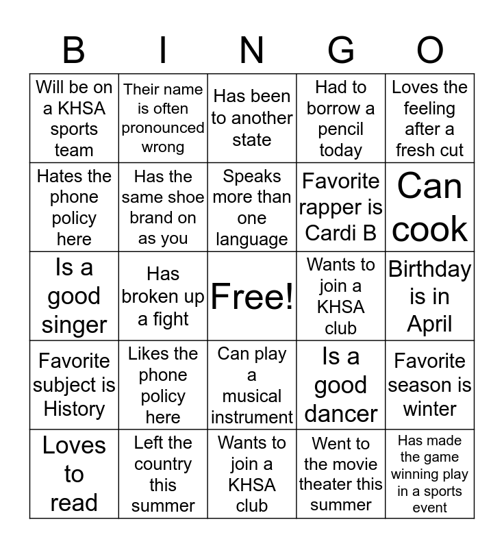 This bingo card has a free space and 24 words: Likes the phone policy here, Left the country this summer, Speaks more than one language, Loves to read, Loves the feeling after a fresh cut, Will be on a KHSA sports team, Hates the phone policy here, Their name is often pronounced wrong, Wants to join a KHSA club, Can play a musical instrument, Favorite rapper is Cardi B, Is a good singer, Is a good dancer, Favorite season is winter, Has the same shoe brand on as you, Went to the movie theater this summer, Birthday is in April, Has been to another state, Can cook, Has broken up a fight, Has made the game winning play in a sports event, Favorite subject is History, Had to borrow a pencil today and Wants to join a KHSA club.