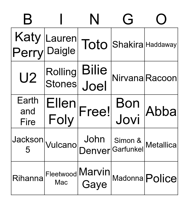 This bingo card has a free space and 34 words: Queen, Madonna, Adele, Anouk, Jackson 5, Rolling Stones, Haddaway, Rihanna, Lauren Daigle, Spice Girls, Bilie Joel, Toto, Fats Domino, Bruno Mars, Bon Jovi, Racoon, Fleetwood Mac, Earth and Fire, Vulcano, Simon & Garfunkel, John Denver, Roy Orbison, Katy Perry, Abba, Marvin Gaye, Police, Shakira, Van Morrison, Nirvana, U2, Guns 'n Roses, Ellen Foly, Metallica and Kiss.