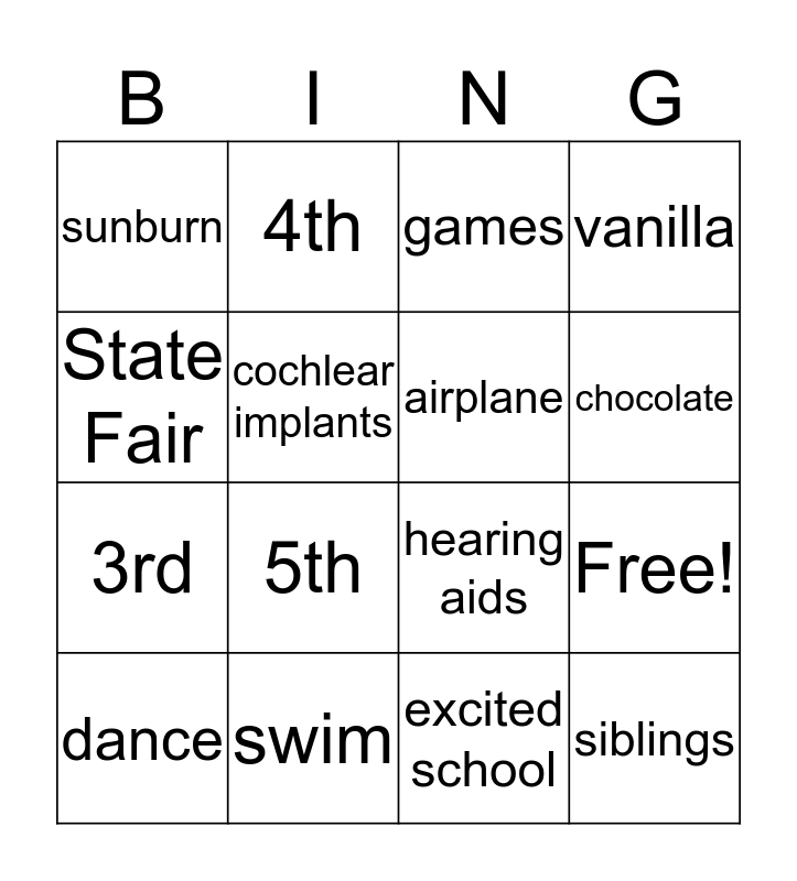 This bingo card has 20 words: Free!, sports, games, pets, dance, State Fair, swim, sunburn, 3rd, 4th, 5th, hearing aids, cochlear implants, siblings, airplane, boat, chocolate, vanilla, excited school and miss Summer.