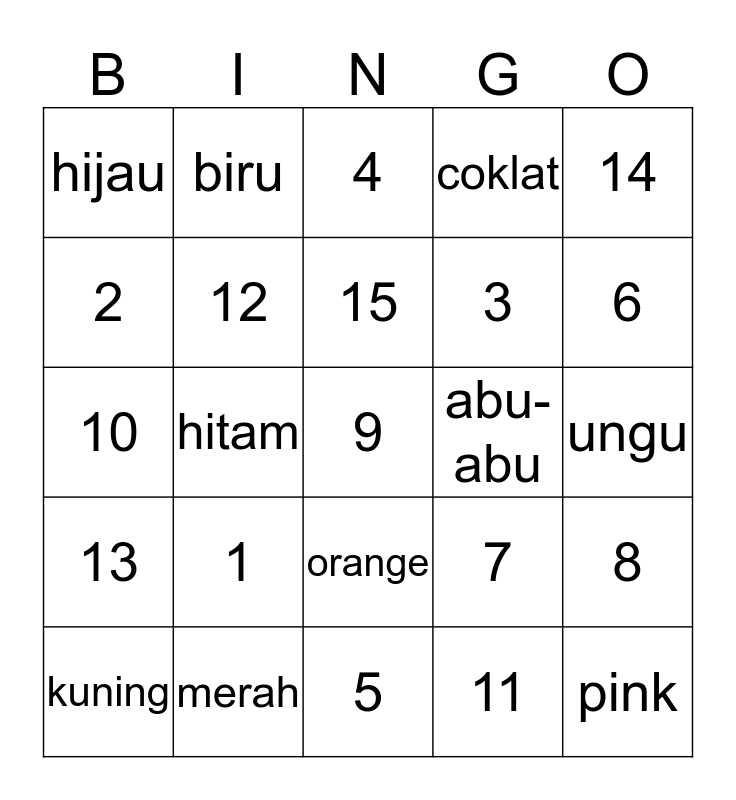 This bingo card has a free space and 24 words: 1, merah, 15, kuning, 14, hijau, 2, biru, abu-abu, orange, 3, 10, 7, 8, 12, 11, ungu, 4, 6, hitam, pink, 13, coklat and 5.