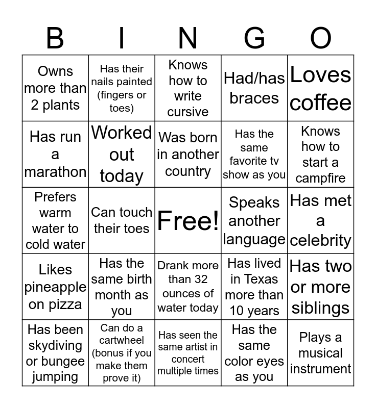 This bingo card has a free space and 34 words: Can juggle, Has the same color eyes as you, Considers themselves an excellent driver, Has the same middle initial as you, Likes pineapple on pizza, Worked out today, Loves coffee, Has been skydiving or bungee jumping, Has their nails painted (fingers or toes), Is left handed, Was born in another country, Knows how to write cursive, Sleeps on their stomach, Knows how to do a sun salutation, Speaks another language, Knows how to start a campfire, Can do a cartwheel (bonus if you make them prove it), Prefers warm water to cold water, Has the same birth month as you, Has lived in Texas more than 10 years, Drank more than 32 ounces of water today, Has/had an out of state license, Owns more than 2 plants, Has met a celebrity, Has seen the same artist in concert multiple times, Plays a musical instrument, Had/has braces, Has never broken a bone, Has the same favorite tv show as you, Has run a marathon, Has finished a book in the past month, Can touch their toes, Has two or more siblings and Likes the same ice cream flavor as you.