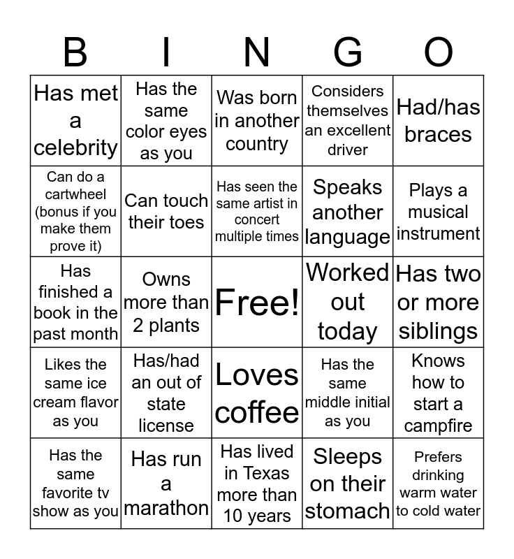 This bingo card has a free space and 34 words: Has their nails painted (fingers or toes), Sleeps on their stomach, Has the same birth month as you, Has never broken a bone, Likes the same ice cream flavor as you, Can touch their toes, Had/has braces, Has the same favorite tv show as you, Has the same color eyes as you, Knows how to write cursive, Has seen the same artist in concert multiple times, Was born in another country, Can juggle, Drank more than 32 ounces of water today, Worked out today, Plays a musical instrument, Has run a marathon, Has finished a book in the past month, Has/had an out of state license, Has the same middle initial as you, Loves coffee, Has been skydiving or bungee jumping, Has met a celebrity, Has two or more siblings, Has lived in Texas more than 10 years, Prefers drinking warm water to cold water, Considers themselves an excellent driver, Knows how to do a sun salutation, Speaks another language, Can do a cartwheel (bonus if you make them prove it), Is left handed, Owns more than 2 plants, Knows how to start a campfire and Likes pineapple on pizza.