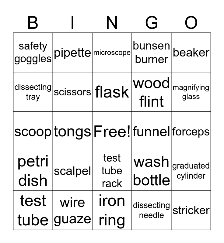 This bingo card has a free space and 24 words: scalpel, wire guaze, flask, test tube, beaker, safety goggles, dissecting tray, pipette, funnel, test tube rack, wood flint, scoop, wash bottle, graduated cylinder, scissors, dissecting needle, forceps, microscope, magnifying glass, tongs, stricker, petri dish, bunsen burner and iron ring.
