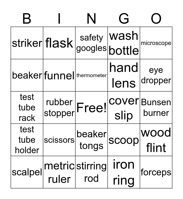 This bingo card has a free space and 24 words: scissors, metric ruler, thermometer, scalpel, microscope, striker, beaker, flask, cover slip, beaker tongs, hand lens, test tube rack, scoop, wood flint, funnel, iron ring, Bunsen burner, safety googles, eye dropper, rubber stopper, forceps, test tube holder, wash bottle and stirring rod.