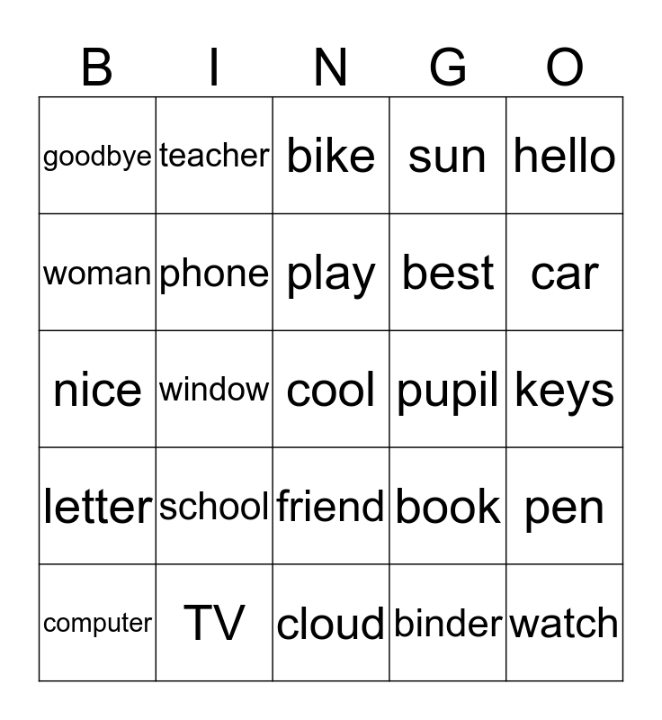 This bingo card has a free space and 24 words: school, TV, play, computer, hello, goodbye, woman, teacher, pupil, friend, best, nice, book, pen, phone, binder, keys, bike, car, window, watch, letter, sun and cloud.