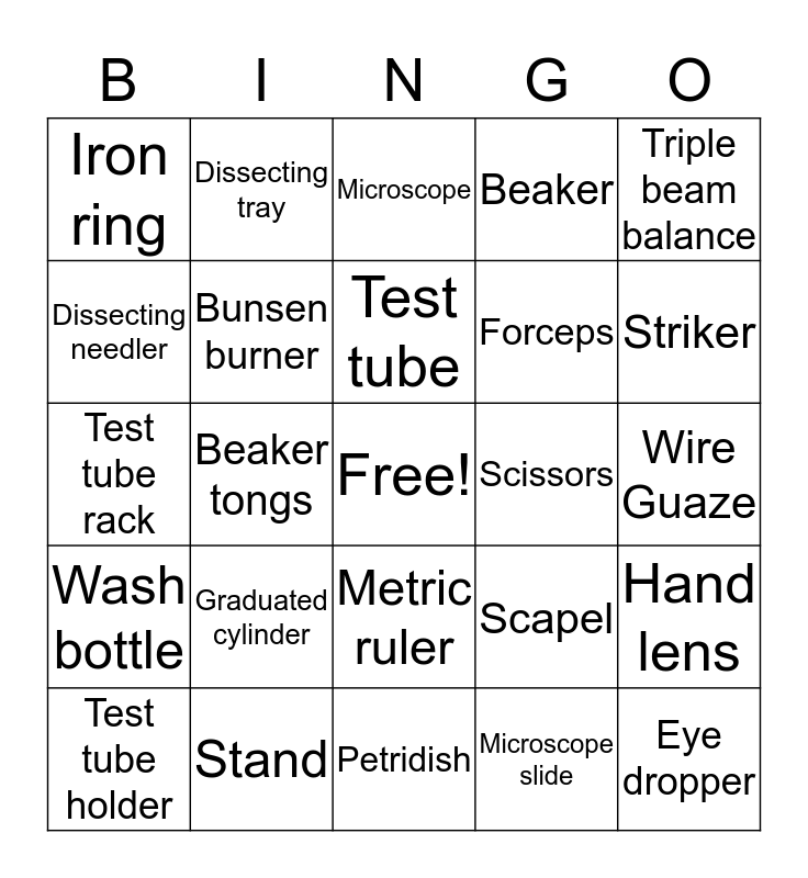 This bingo card has a free space and 24 words: Graduated cylinder, Stand, Test tube, Test tube holder, Triple beam balance, Iron ring, Dissecting needler, Dissecting tray, Scissors, Metric ruler, Forceps, Test tube rack, Scapel, Hand lens, Bunsen burner, Microscope slide, Wire Guaze, Microscope, Striker, Beaker tongs, Eye dropper, Wash bottle, Beaker and Petridish.