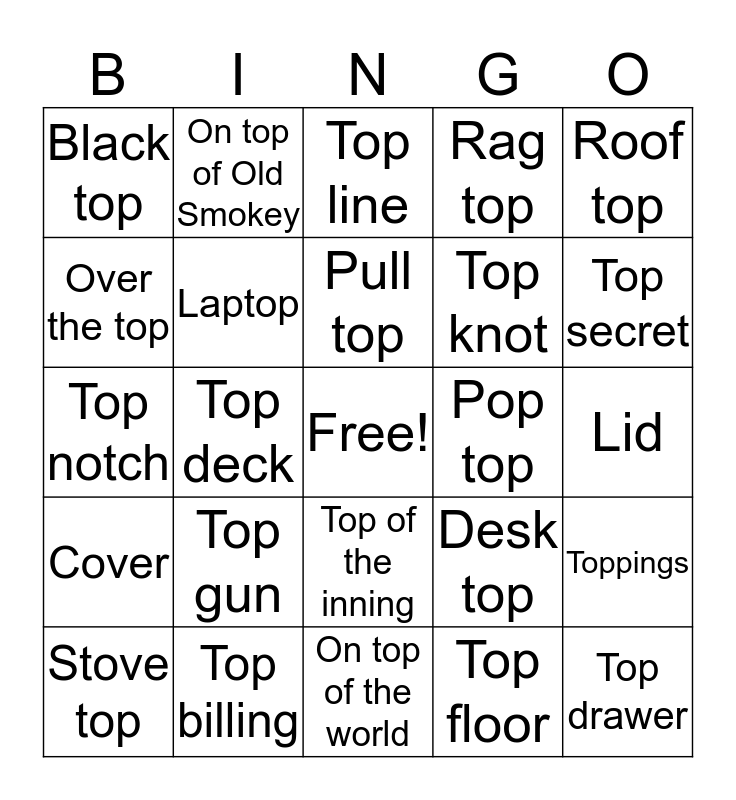This bingo card has a free space and 73 words: Big top, Bikini top, Black top, Carrot top, Cherry top, Counter-top, Cover, Curly top, Desk top, Flat top, Four-top, Hard top, Laptop, Lid, Mountain top, On top of Old Smokey, On top of the world, Over the top, Peak, Pop top, Pull top, Rag top, Roof top, Spinning top, Stove top, Summit, Table top, Tank top, Tip-top, Top banana, Top billing, Top brass, Top cat, Top chef, Top deck, Top dog, Top dollar, Top down, Top drawer, Top flight, Top floor, Top gun, Top hat, Top heavy, Top job, Top knot, Top line, Top marks, Top model, Top notch, Top of mind, Top of the charts, Top of the class, Top of the division, Top of the food chain, Top of the heap, Top of the hill, Top of the inning, Top of the morning, Top off, Top priority, Top quality, Top ranked, Top secret, Top shelf, Top side, Top soil, Top ten, Toppings, Tree top, Tube top, Up top and View from the top.