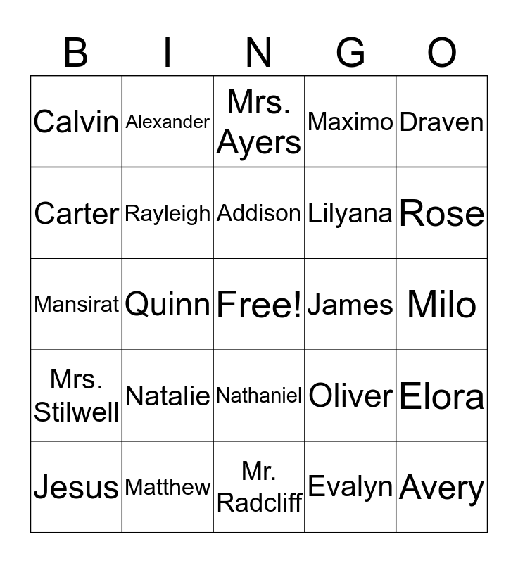 This bingo card has a free space and 24 words: Natalie, Matthew, Addison, Jesus, Draven, Calvin, Carter, Alexander, James, Nathaniel, Lilyana, Mansirat, Oliver, Elora, Rayleigh, Evalyn, Milo, Mrs. Ayers, Rose, Quinn, Avery, Mrs. Stilwell, Maximo and Mr. Radcliff.