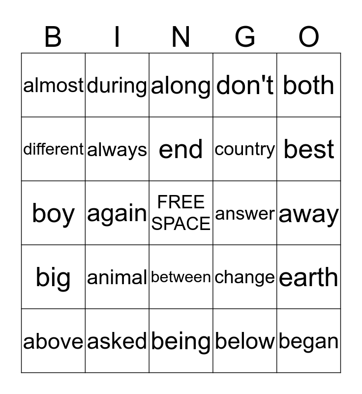 This bingo card has a free space and 29 words: above, across, again, air, almost, along, always, animal, answer, asked, away, began, being, below, best, better, between, big, both, boy, change, children, country, different, don't, during, earth, end and enough.