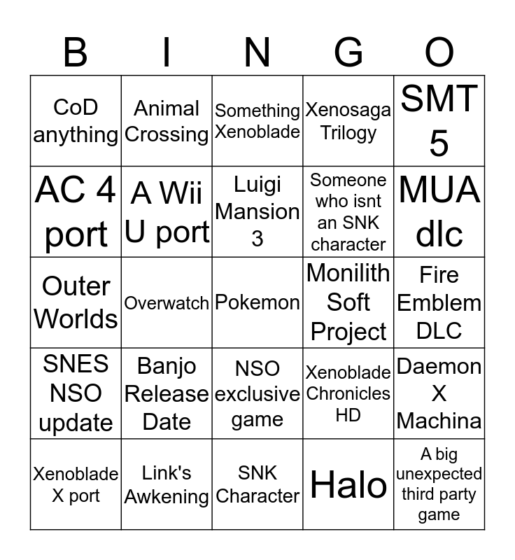 This bingo card has a free space and 24 words: Banjo Release Date, Link's Awkening, Luigi Mansion 3, Xenoblade X port, SMT 5, CoD anything, AC 4 port, Animal Crossing, Monilith Soft Project, NSO exclusive game, Someone who isnt an SNK character, Outer Worlds, Xenoblade Chronicles HD, Daemon X Machina, A Wii U port, Halo, Fire Emblem DLC, Something Xenoblade, MUA dlc, Overwatch, A big unexpected third party game, SNES NSO update, Xenosaga Trilogy and SNK Character.