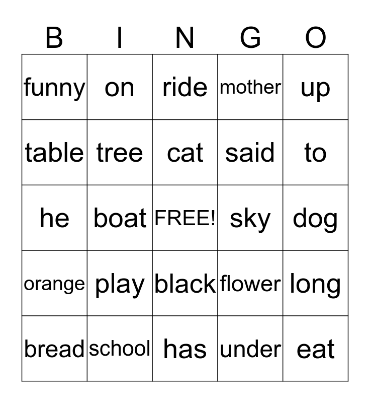 This bingo card has a free space and 24 words: play, school, cat, bread, up, funny, table, on, sky, black, said, he, flower, long, tree, under, dog, ride, to, boat, eat, orange, mother and has.