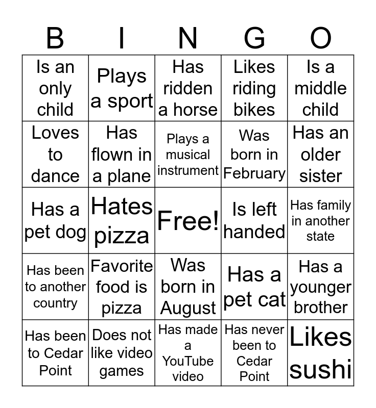 This bingo card has a free space and 24 words: Favorite food is pizza, Does not like video games, Plays a musical instrument, Has been to Cedar Point, Is a middle child, Is an only child, Loves to dance, Plays a sport, Is left handed, Was born in August, Was born in February, Has a pet dog, Has a pet cat, Has a younger brother, Has flown in a plane, Has never been to Cedar Point, Has family in another state, Has ridden a horse, Has an older sister, Hates pizza, Likes sushi, Has been to another country, Likes riding bikes and Has made a YouTube video.