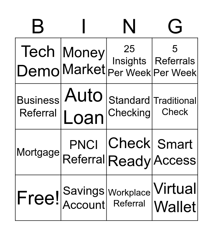 This bingo card has 17 words: Free!, Savings Account, 25 Insights Per Week, 5 Referrals Per Week, Mortgage, Auto Loan, Check Ready, Traditional Check, Business Referral, PNCI Referral, Workplace Referral, Smart Access, Tech Demo, Money Market, Standard Checking, Virtual Wallet and Credit Card.