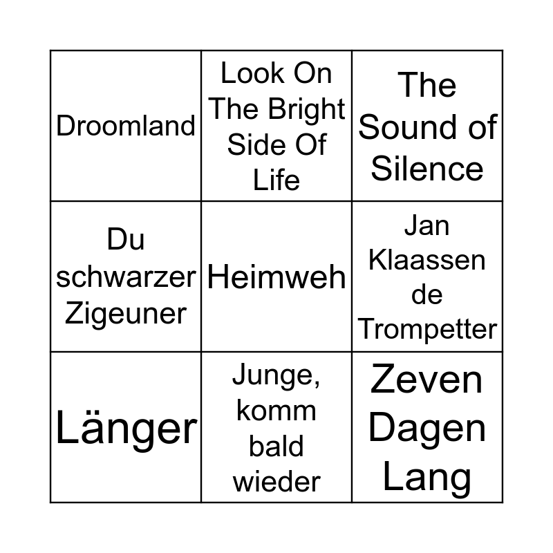 This bingo card has 39 words: An der Nordseeküste, Denn wenn et Trömmelche jeht, D’r Sjunste Koeër, Länger, Echte Fründe, Hey Kölle, Junge, komm bald wieder, Die Gitarre und das Meer, Heimweh, Tanze mit mir in den Morgen, Du kannst nicht immer 17 sein, Du schwarzer Zigeuner, Flieger-Marsch, Los ‘t zieë, Mit de Naas Umhoeëg, Koele en Kuulkes, De Klokke van de Lambeëtus, Droomland, Het Dorp, Het Piemellied, Jan Klaassen de Trompetter, Land van Maas en Waal, Zeven Dagen Lang, Iedereen is van de wereld, Hormonen, Hallelujah, Piano Man, Beautiful Noise, Sweet Caroline, Look On The Bright Side Of Life, I’m a Believer, Song Sung Blue, The Sound of Silence, Ramona, It Never Rains in S. California, When I’m sixty-four, I’m a Soul Man, Sweet Home Chicago and Bésame Mucho.