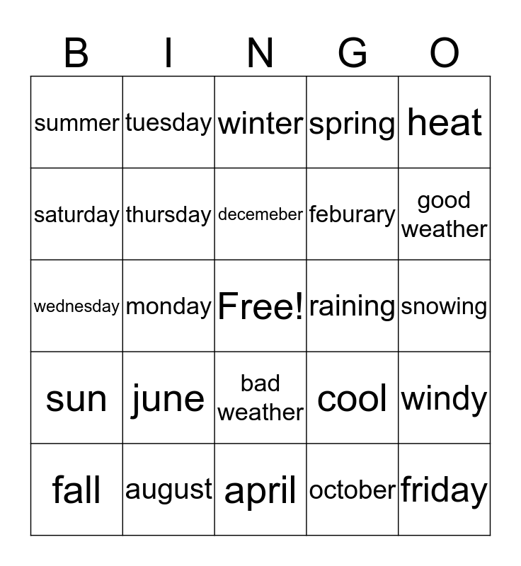 This bingo card has a free space and 24 words: june, august, decemeber, fall, heat, summer, saturday, tuesday, raining, bad weather, feburary, wednesday, cool, windy, thursday, october, snowing, winter, good weather, monday, friday, sun, spring and april.