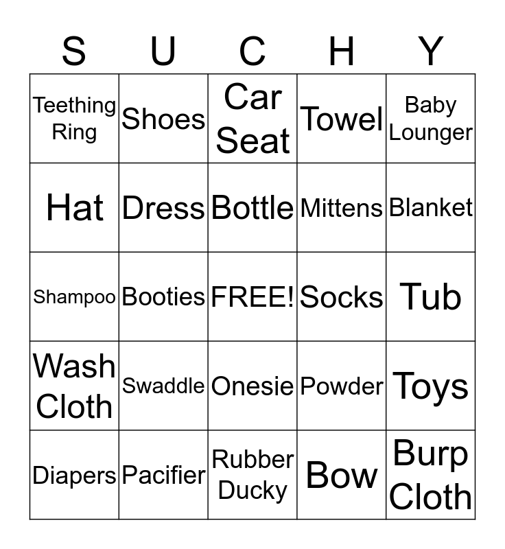 This bingo card has a free space and 24 words: Swaddle, Pacifier, Bottle, Diapers, Baby Lounger, Teething Ring, Hat, Shoes, Socks, Onesie, Mittens, Shampoo, Powder, Toys, Dress, Bow, Tub, Car Seat, Blanket, Booties, Burp Cloth, Wash Cloth, Towel and Rubber Ducky.