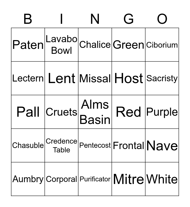 This bingo card has 25 words: Credence Table, Purificator, Missal, Aumbry, Ciborium, Paten, Lectern, Lavabo Bowl, Red, Pentecost, Host, Pall, Frontal, Nave, Lent, White, Purple, Chalice, Sacristy, Cruets, Alms Basin, Corporal, Chasuble, Green and Mitre.