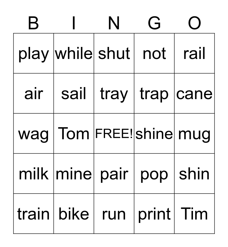 This bingo card has a free space and 24 words: mine, bike, tray, train, rail, play, air, while, shine, pair, trap, wag, pop, shin, sail, print, mug, shut, cane, Tom, Tim, milk, not and run.
