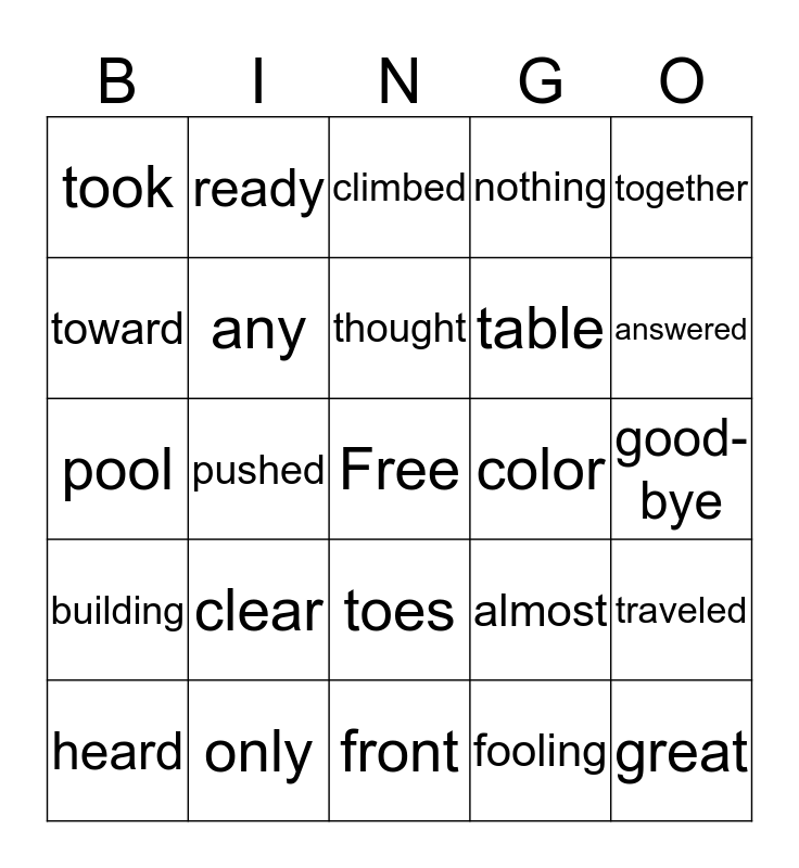 This bingo card has a free space and 24 words: clear, only, thought, heard, together, took, toward, ready, color, toes, table, pool, almost, traveled, any, fooling, good-bye, climbed, answered, pushed, great, building, nothing and front.