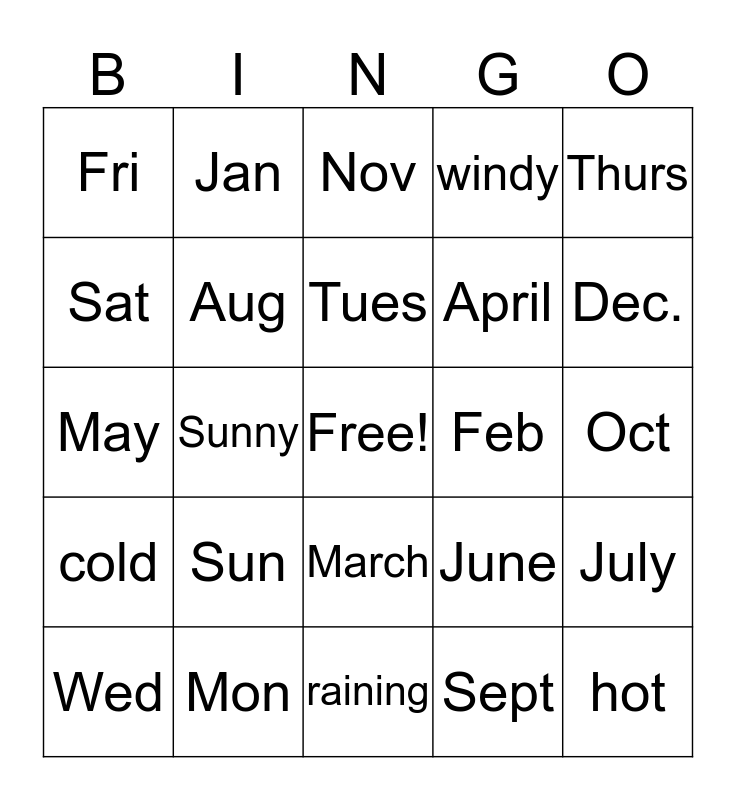 This bingo card has a free space and 24 words: Sun, Mon, Tues, Wed, Thurs, Fri, Sat, Jan, Feb, March, April, May, June, July, Aug, Sept, Oct, Nov, Dec., Sunny, hot, cold, windy and raining.