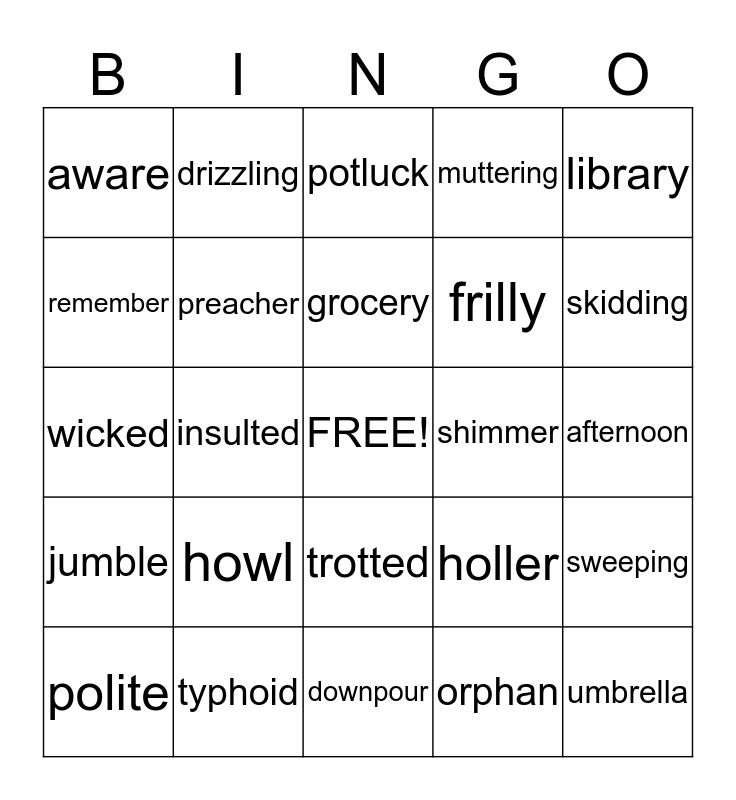 This bingo card has a free space and 24 words: howl, typhoid, grocery, polite, library, aware, remember, drizzling, shimmer, trotted, frilly, wicked, holler, sweeping, preacher, orphan, afternoon, potluck, skidding, insulted, umbrella, jumble, muttering and downpour.