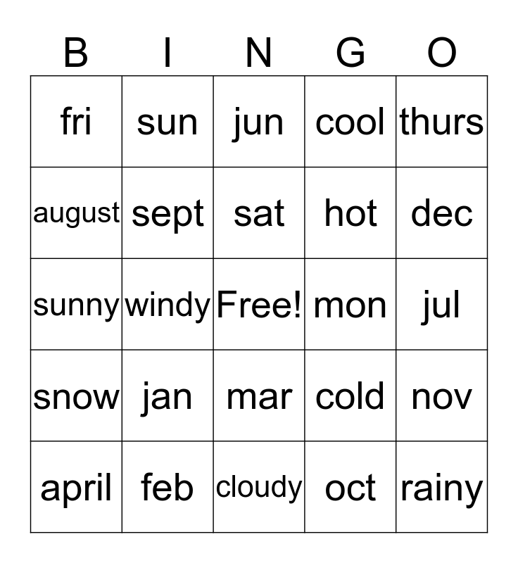 This bingo card has a free space and 24 words: jan, feb, sat, april, thurs, fri, august, sun, mon, mar, hot, sunny, cold, nov, sept, oct, jul, jun, dec, windy, rainy, snow, cool and cloudy.