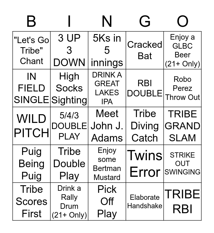 This bingo card has a free space and 34 words: FRANKIE SMILES, Elaborate Handshake, Tribe Stolen Base, Slamtana HR, Puig Being Puig, High Socks Sighting, Enjoy a GLBC Beer (21+ Only), Tribe Scores First, 3 UP 3 DOWN, TRIBE HOME RUN, DRINK A GREAT LAKES IPA, 5Ks in 5 innings, Eat A Game Day Special, Francona pops in bubblegum, Tribe Diving Catch, Robo Perez Throw Out, Drink a Rally Drum (21+ Only), WILD PITCH, Tribe Double Play, Twins Error, Enjoy some Bertman Mustard, Tribe Player Walked, "Let's Go Tribe" Chant, TRIBE GRAND SLAM, Pick Off Play, TRIBE RBI, Cracked Bat, Fly Ball Out, RBI DOUBLE, IN FIELD SINGLE, FULL COUNT, 5/4/3 DOUBLE PLAY, STRIKE OUT SWINGING and Single to Center.