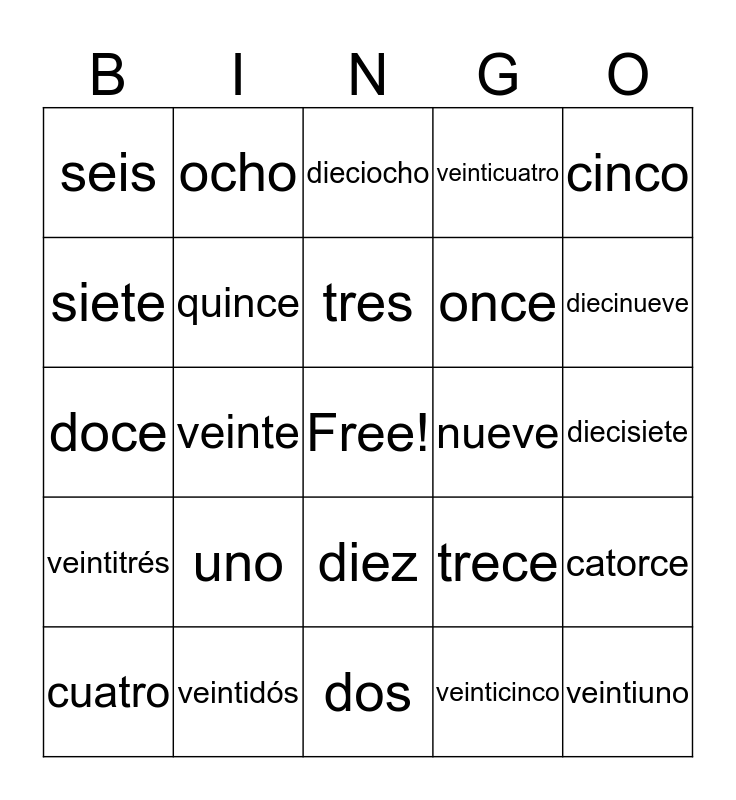 This bingo card has a free space and 25 words: uno, dos, tres, cuatro, cinco, seis, siete, ocho, nueve, diez, once, doce, trece, catorce, quince, dieciséis, diecisiete, dieciocho, diecinueve, veinte, veintiuno, veintidós, veintitrés, veinticuatro and veinticinco.