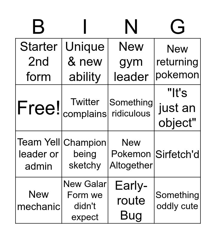 This bingo card has 16 words: New Galar Form we didn't expect, Sirfetch'd, New gym leader, Starter 2nd form, Team Yell leader or admin, Unique & new ability, New Pokemon Altogether, Early-route Bug, Free!, Twitter complains, New mechanic, New returning pokemon, Champion being sketchy, "It's just an object", Something ridiculous and Something oddly cute.