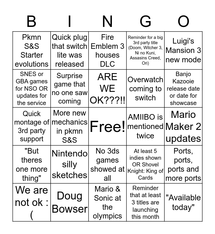 This bingo card has a free space and 24 words: Nintendo silly sketches, Doug Bowser, ARE WE OK???!!, We are not ok :(, Luigi's Mansion 3 new mode, Pkmn S&S Starter evolutions, SNES or GBA games for NSO OR updates for the service, Quick plug that switch lite was released, AMIIBO is mentioned twice, No 3ds games showed at all, Overwatch coming to switch, Quick montage of 3rd party support, At least 5 indies shown OR Shovel Knight: King of Cards, Ports, ports, ports and more ports, Surprise game that no one saw coming, Reminder that at least 3 titles are launching this month, Mario Maker 2 updates, Fire Emblem 3 houses DLC, Banjo Kazooie release date or date for showcase, More new mechanics in pkmn S&S, "Available today", "But theres one more thing", Reminder for a big 3rd party title (Doom, Witcher 3, Ni no Kuni, Assasins Creed, Ori) and Mario & Sonic at the olympics.