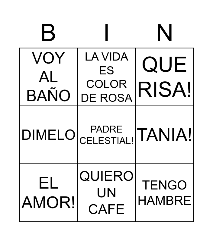 This bingo card has 11 words: TENGO HAMBRE, QUIERO UN CAFE, PADRE CELESTIAL!, EL AMOR!, LA VIDA ES COLOR DE ROSA, QUE RISA!, TANIA!, ME DUELE LA CABEZA, DIMELO, VOY AL BAÑO and QUE RELAJO.