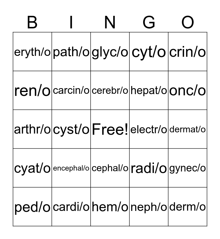 This bingo card has a free space and 41 words: aden/o, arthr/o, bi/o, carcin/o, cardi/o, cephal/o, cerebr/o, cis/o, crin/o, cyat/o, cyst/o, cyt/o, derm/o, dermat/o, electr/o, encephal/o, enter/o, eryth/o, gastr/o, glyc/o, gynec/o, hemat/o, hem/o, hepat/o, leuk/o, log/o, neph/o, neur/o, onc/o, opthalm/o, oste/o, path/o, ped/o, psych/o, radi/o, ren/o, rhin/o, sarc/o, sect/o, thromb/o and ur/o.