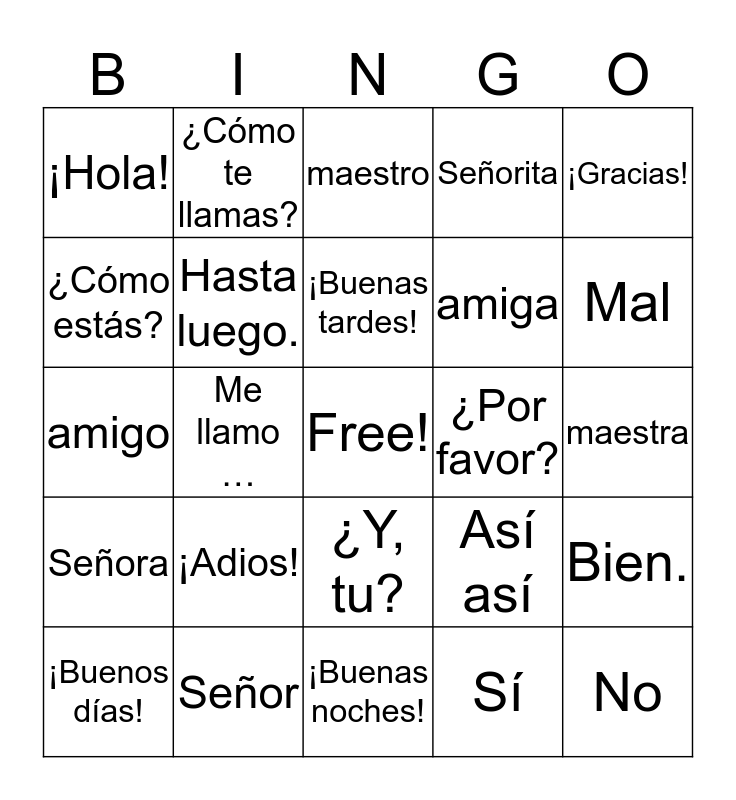 This bingo card has a free space and 25 words: ¡Adios!, ¡Buenas noches!, ¡Buenas tardes!, ¡Buenos días!, ¡Gracias!, ¡Hola!, ¿Cómo estás?, ¿Cómo te llamas?, ¿Por favor?, ¿Y, tu?, amiga, amigo, Así así, Bien., Hasta luego., Hasta mañana., maestra, maestro, Mal, Me llamo …, No, Señor, Señora, Señorita and Sí.
