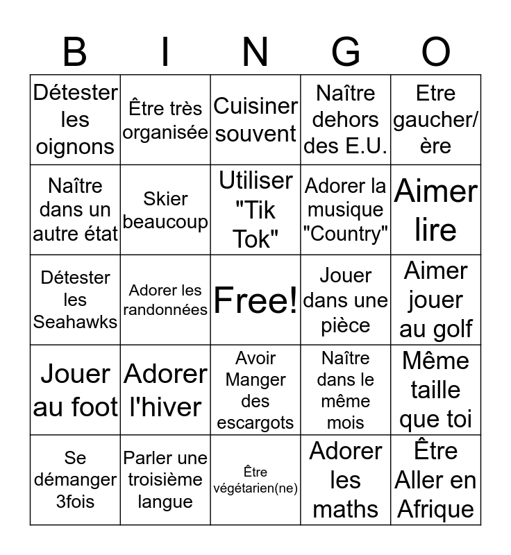This bingo card has a free space and 24 words: Adorer l'hiver, Parler une troisième langue, Utiliser "Tik Tok", Se démanger 3fois, Etre gaucher/ère, Détester les oignons, Naître dans un autre état, Être très organisée, Jouer dans une pièce, Avoir Manger des escargots, Adorer la musique "Country", Détester les Seahawks, Naître dans le même mois, Même taille que toi, Skier beaucoup, Adorer les maths, Aimer jouer au golf, Cuisiner souvent, Aimer lire, Adorer les randonnées, Être Aller en Afrique, Jouer au foot, Naître dehors des E.U. and Être végétarien(ne).