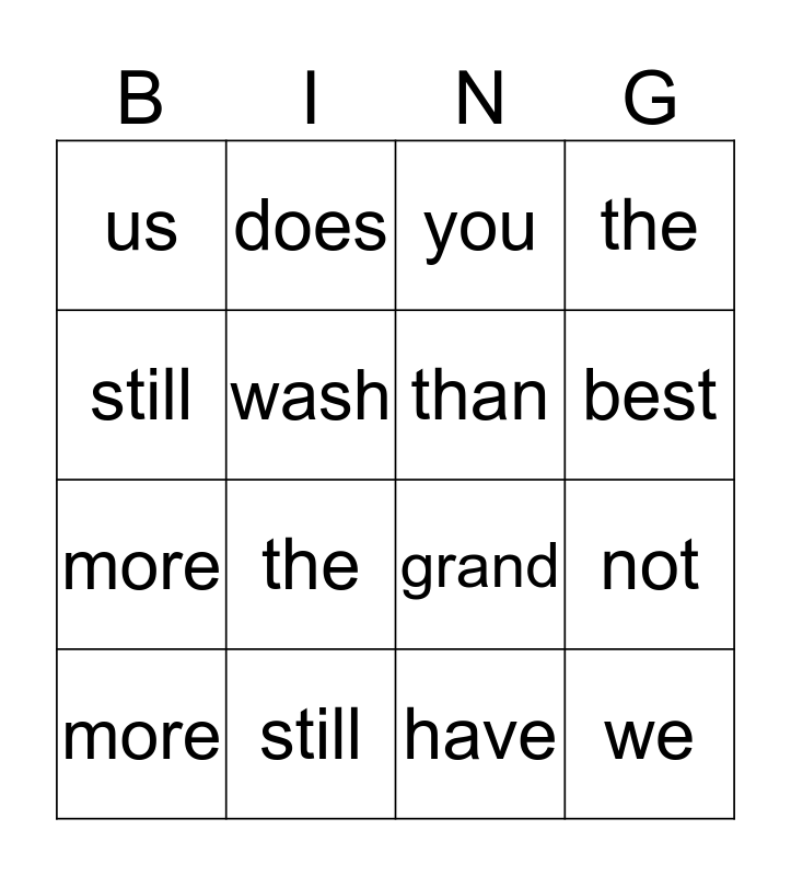 This bingo card has 16 words: still, not, you, us, more, does, grand, have, still, wash, more, the, the, best, than and we.
