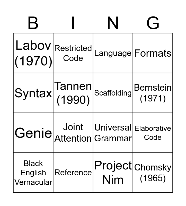 This bingo card has 28 words: LAD, Bruner (1966), Genie, Innate, Tannen (1990), Language, Restricted Code, Chomsky (1965), Reference, Hedges, Universal Grammar, Formats, Learned, Rapport Talk, Joint Attention, Parents, Critical Period, Scaffolding, Bernstein (1971), LASS, Labov (1970), Report Talk, Black English Vernacular, Elaborative Code, Project Nim, Malcolm (2003), Syntax and Feral Child.
