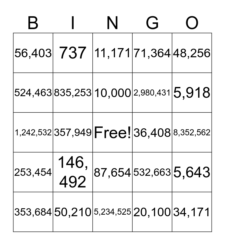This bingo card has a free space and 24 words: 146, 492, 50,210, 10,000, 353,684, 48,256, 56,403, 524,463, 737, 36,408, 87,654, 2,980,431, 1,242,532, 532,663, 5,643, 835,253, 20,100, 8,352,562, 11,171, 5,918, 357,949, 34,171, 253,454, 71,364 and 5,234,525.