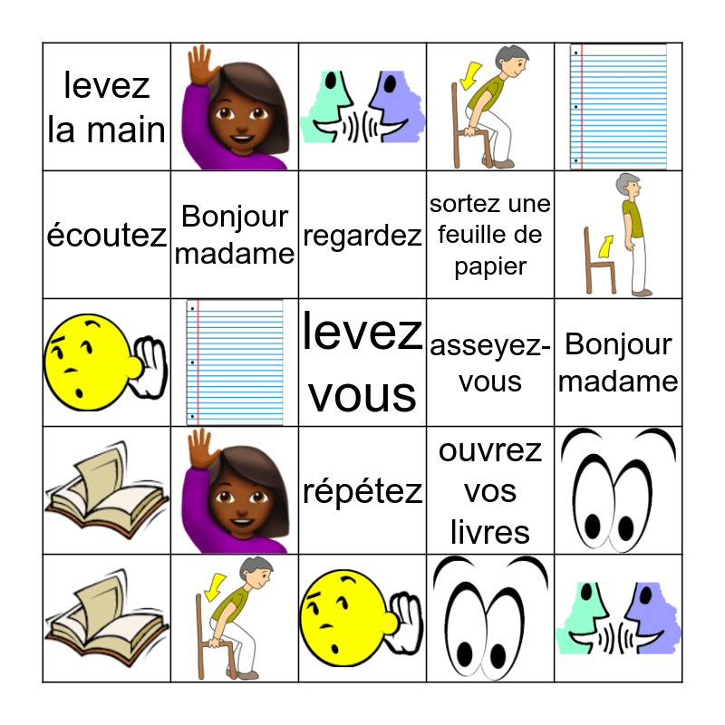 This bingo card has 15 images, a free space and 9 words: regardez, levez la main, écoutez, asseyez-vous, répétez, sortez une feuille de papier, ouvrez vos livres, Bonjour madame and Bonjour madame.