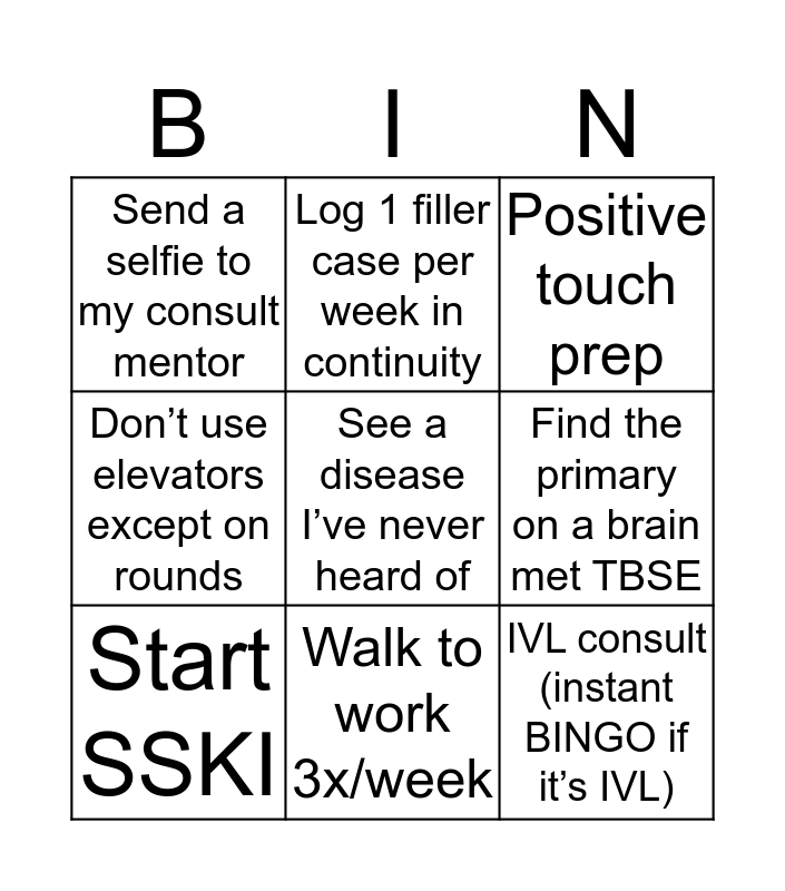 This bingo card has 9 words: Start SSKI, Positive touch prep, Log 1 filler case per week in continuity, Don’t use elevators except on rounds, Send a selfie to my consult mentor, Find the primary on a brain met TBSE, See a disease I’ve never heard of, IVL consult (instant BINGO if it’s IVL) and Walk to work 3x/week.