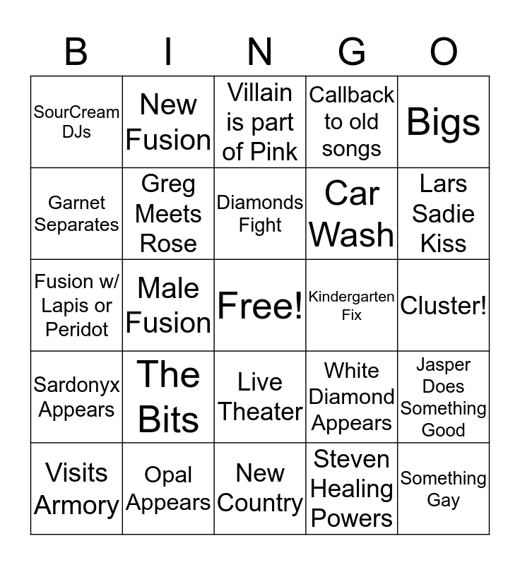 This bingo card has a free space and 24 words: The Bits, Opal Appears, Diamonds Fight, Visits Armory, Bigs, SourCream DJs, Garnet Separates, New Fusion, Kindergarten Fix, Live Theater, Car Wash, Fusion w/ Lapis or Peridot, White Diamond Appears, Jasper Does Something Good, Greg Meets Rose, Steven Healing Powers, Cluster!, Villain is part of Pink, Lars Sadie Kiss, Male Fusion, Something Gay, Sardonyx Appears, Callback to old songs and New Country.