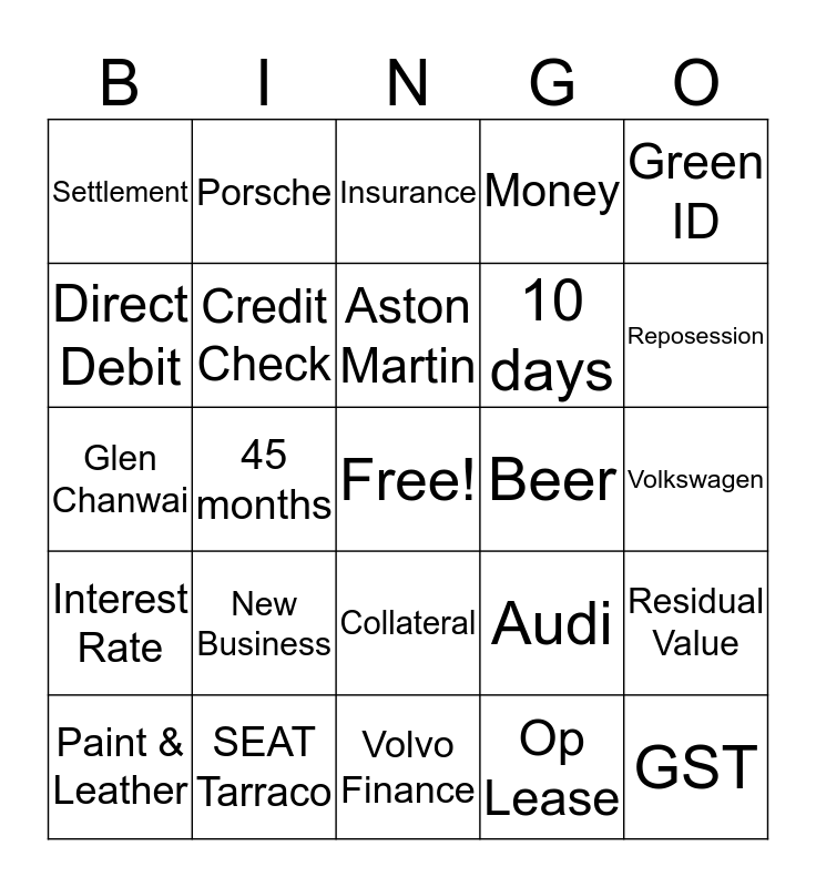 This bingo card has a free space and 24 words: New Business, SEAT Tarraco, Aston Martin, Paint & Leather, Green ID, Settlement, Direct Debit, Porsche, Beer, Collateral, 10 days, Glen Chanwai, Audi, Residual Value, Credit Check, Op Lease, Volkswagen, Insurance, Reposession, 45 months, GST, Interest Rate, Money and Volvo Finance.