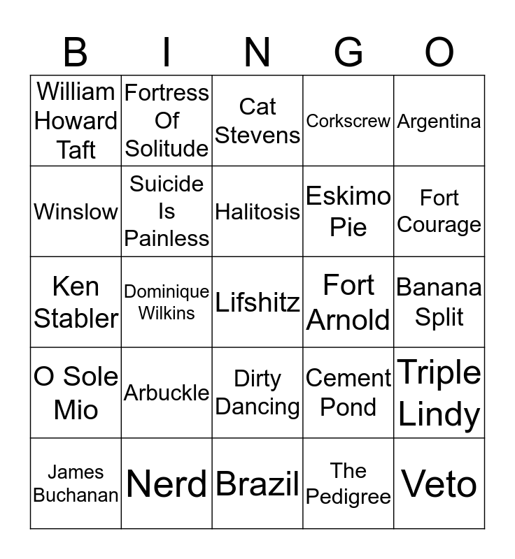 This bingo card has 25 words: Arbuckle, Brazil, Halitosis, James Buchanan, Argentina, William Howard Taft, Winslow, Fortress Of Solitude, Fort Arnold, Dirty Dancing, Eskimo Pie, Ken Stabler, Cement Pond, Triple Lindy, Suicide Is Painless, Veto, Banana Split, Cat Stevens, Fort Courage, Dominique Wilkins, Lifshitz, Nerd, O Sole Mio, Corkscrew and The Pedigree.