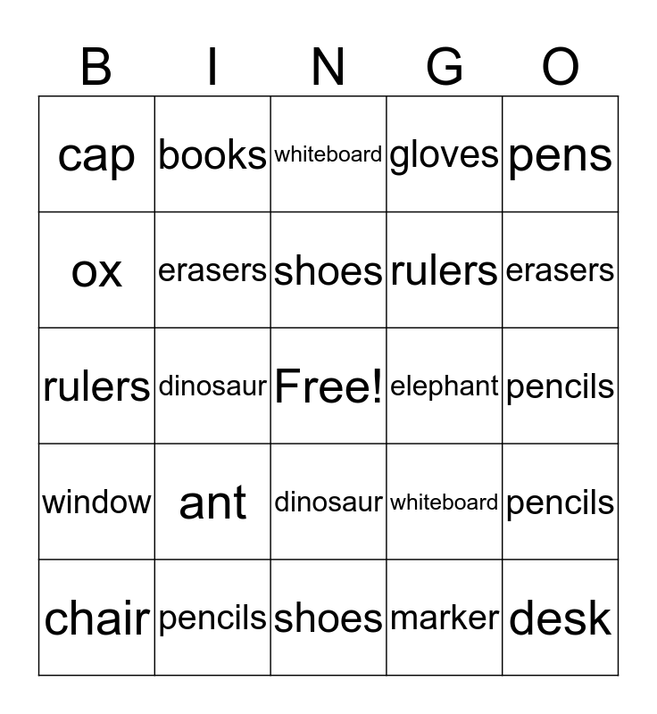 This bingo card has a free space and 45 words: bag, desk, cap, chair, pencils, marker, whiteboard, window, pens, pencils, gloves, elephant, dinosaur, ant, books, shoes, ox, rulers, robots, erasers, books, bag, desk, cap, chair, pencils, marker, ox, whiteboard, window, pens, pencils, gloves, elephant, cap, dinosaur, bag, ant, books, shoes, ox, rulers, robots, erasers and ant.