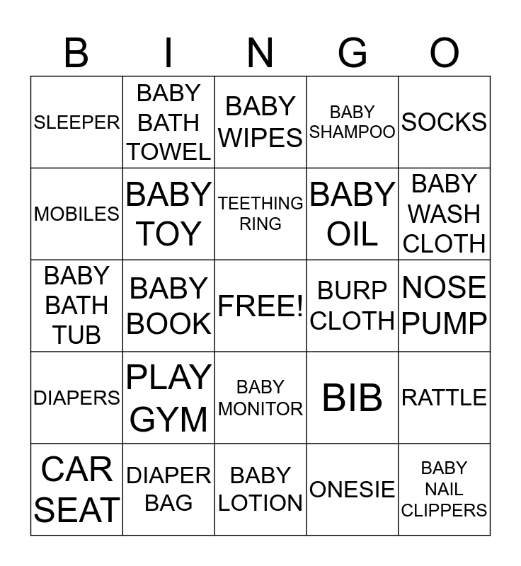 This bingo card has a free space and 34 words: PACIFIER, ONESIE, BABY BLANKET, BOTTLE, DIAPERS, BABY TOY, SOCKS, CAR SEAT, BABY BATH TOWEL, BABY LOTION, TEETHING RING, BABY WIPES, BABY BOUNCER, BOOTIES, BURP CLOTH, BABY WASH CLOTH, DIAPER BAG, BABY BATH TUB, PLAY GYM, BIB, BABY MONITOR, BABY BLANKET, SLEEPER, NOSE PUMP, BABY LOTION, BABY NAIL CLIPPERS, BABY SHAMPOO, BABY POWDER, BABY OIL, MOBILES, FORMULA, BABY BOOK, RATTLE and STROLLER.
