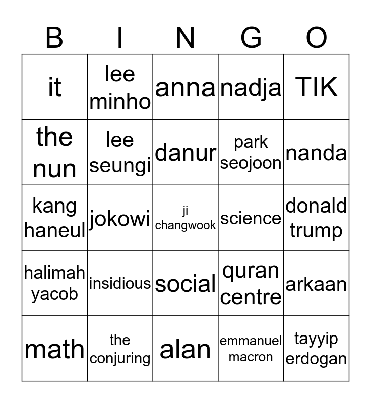 This bingo card has a free space and 24 words: insidious, the conjuring, danur, math, TIK, it, the nun, lee minho, science, social, park seojoon, kang haneul, quran centre, arkaan, lee seungi, emmanuel macron, donald trump, anna, nanda, jokowi, tayyip erdogan, halimah yacob, nadja and alan.