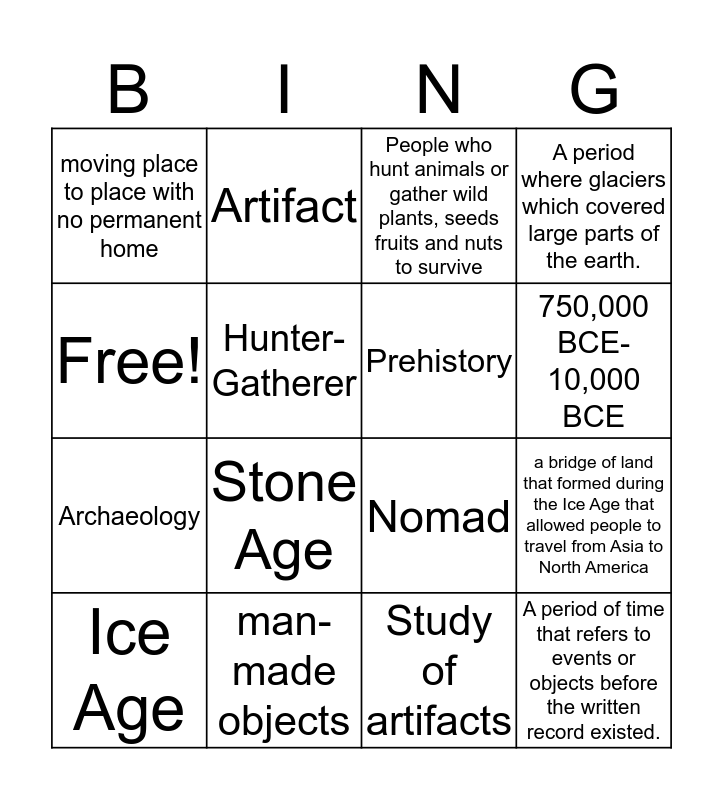 This bingo card has 16 words: man-made objects, a bridge of land that formed during the Ice Age that allowed people to travel from Asia to North America, People who hunt animals or gather wild plants, seeds fruits and nuts to survive, moving place to place with no permanent home, Archaeology, Artifact, Nomad, Study of artifacts, Free!, Hunter-Gatherer, Ice Age, A period where glaciers which covered large parts of the earth., Stone Age, 750,000 BCE-10,000 BCE, Prehistory and A period of time that refers to events or objects before the written record existed..