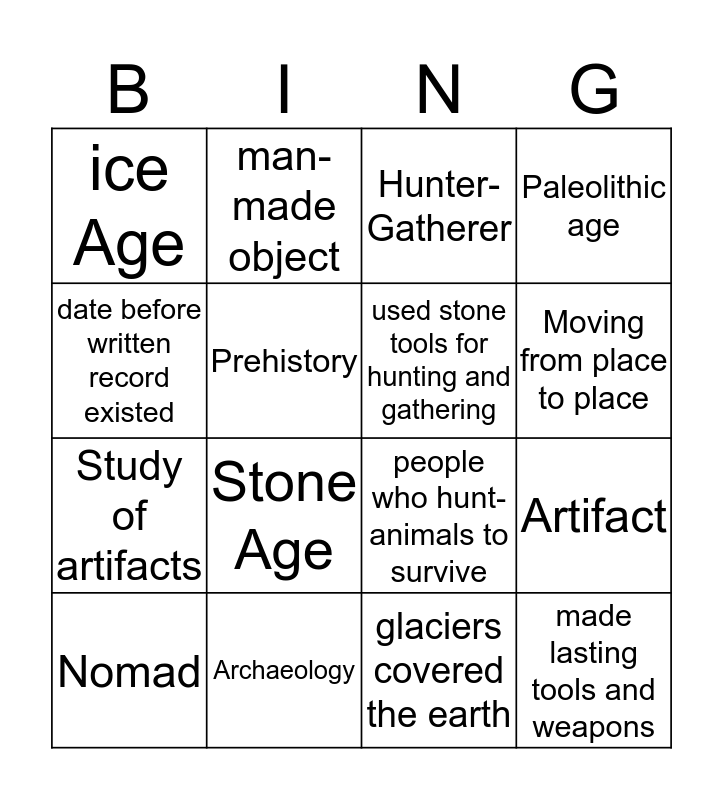 This bingo card has 16 words: Archaeology, Artifact, Hunter-Gatherer, ice Age, Study of artifacts, man-made object, people who hunt-animals to survive, glaciers covered the earth, date before written record existed, Prehistory, Nomad, Paleolithic age, Stone Age, Moving from place to place, used stone tools for hunting and gathering and made lasting tools and weapons.